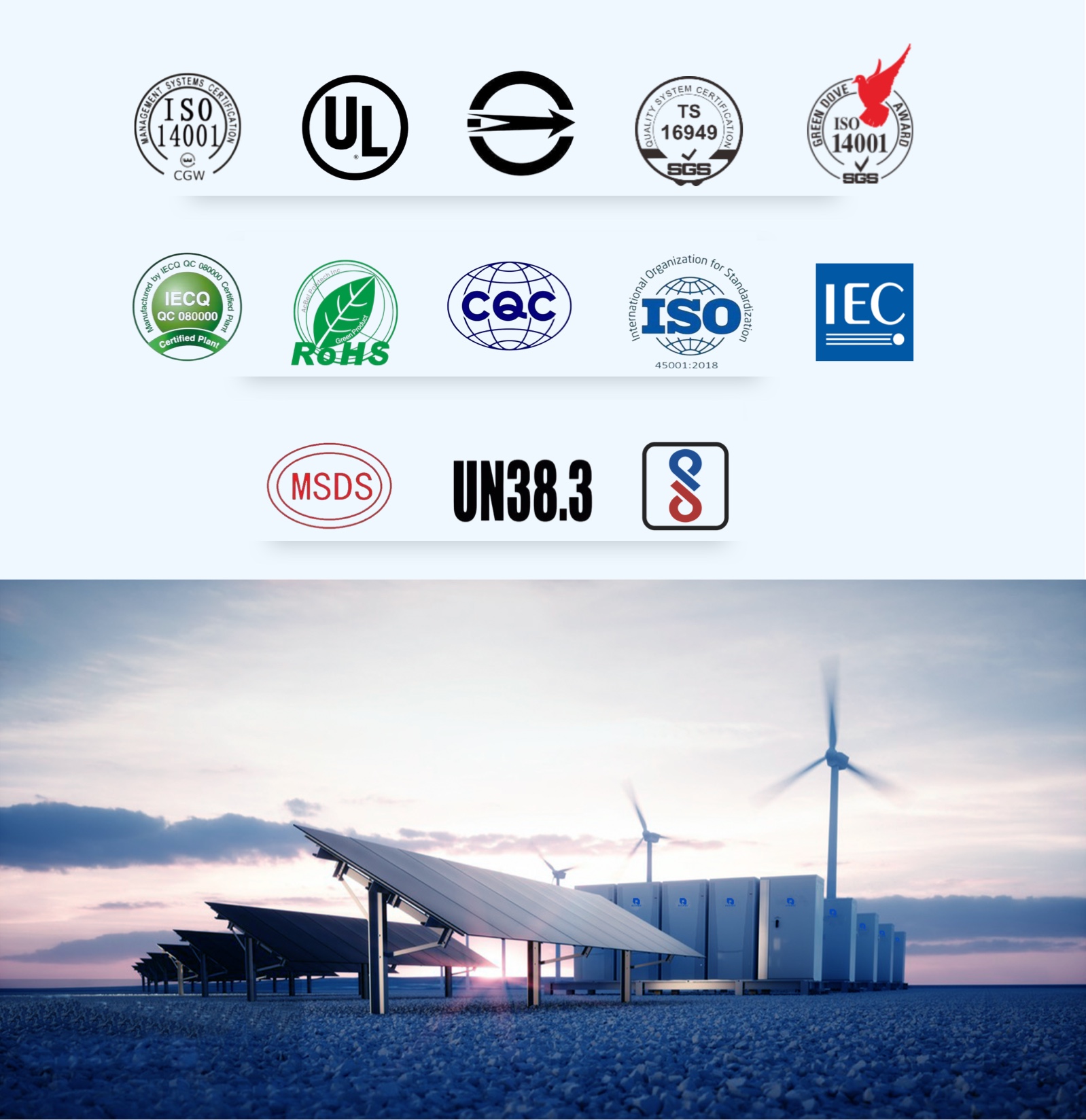4、全系列国际或国家安规认证。三元系列、磷酸铁锂系列锂离 子电池均通过国际或国家第三方机构的检测和认证